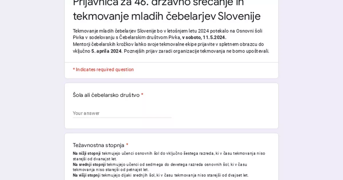 Mentorji čebelarskih krožkov lahko svoje tekmovalne ekipe prijavite v spletnem obrazcu do vključno 5. aprila 2024. Poznejših prijav zaradi organizacije tekmovanja ne bomo upoštevali.