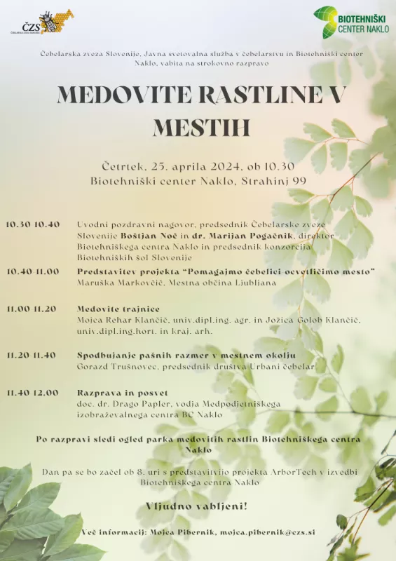 Biotehniški center Naklo, Čebelarska zveza Slovenije, Javna svetovalna služba v čebelarstvu vabijo na strokovno razpravo, MEDOVITE RASTLINE V MESTIH, ki bo potekala v četrtek, 25. aprila 2024 ob 10.30 v okviru dneva odprtih vrat Biotehniškega centra Naklo v Strahinju.